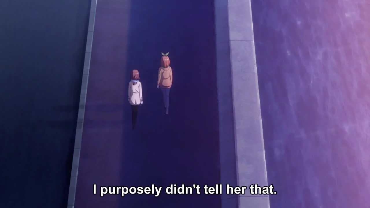 И вот начался выпускной год сестёр Накано. Последний год, который они проведут в «Асахи», а после окончания школы постараются воплотить свои мечты в реальность. Фестиваль старшей школы «Асахи» — последний школьный праздник для пятерняшек. Все ученики вовлечены в атмосферу фестиваля, каждый класс готовит свою особую программу: конкурсы, киоски и тому подобное. Футаро Уэсуги принимает активное участие в организации мероприятия ещё и потому, что хочет сделать его самым незабываем событием для пяти сестёр. В процессе подготовки он вспоминает былое, обдумывает принятые решения и анализирует свои чувства.Осознав и приняв свои чувства, Футаро решил расставить все точки над «и» в последний день фестиваля. Какое решение он принял?