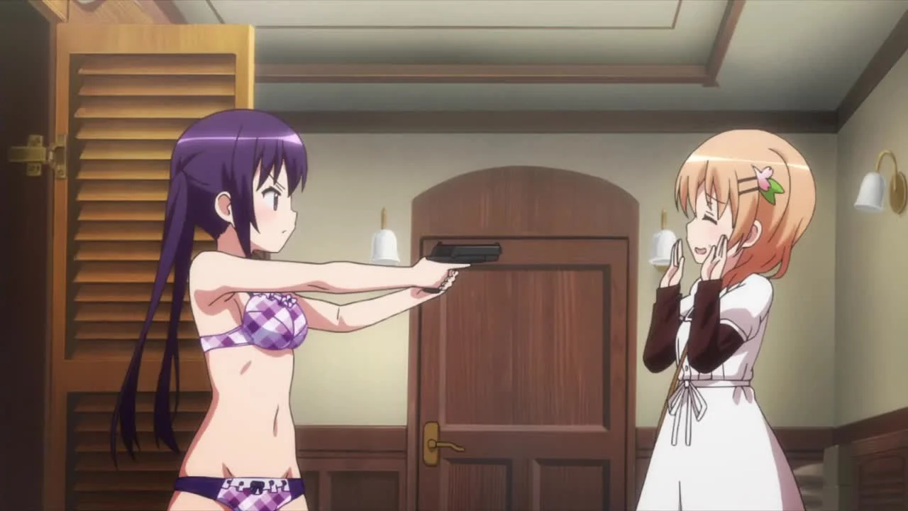 Идя по благоухающей цветами улице и любуясь местными красотами, она останавливается возле вывески с надписью «Дом Кролика». Будучи без ума от этих милых и пушистых зверьков, она, не раздумывая, заходит внутрь. Однако вместо множества кроликов там она встречает тихую девочку Чино , у которой на голове сидит пушистое существо, больше напоминающее кошку, нежели кролика.